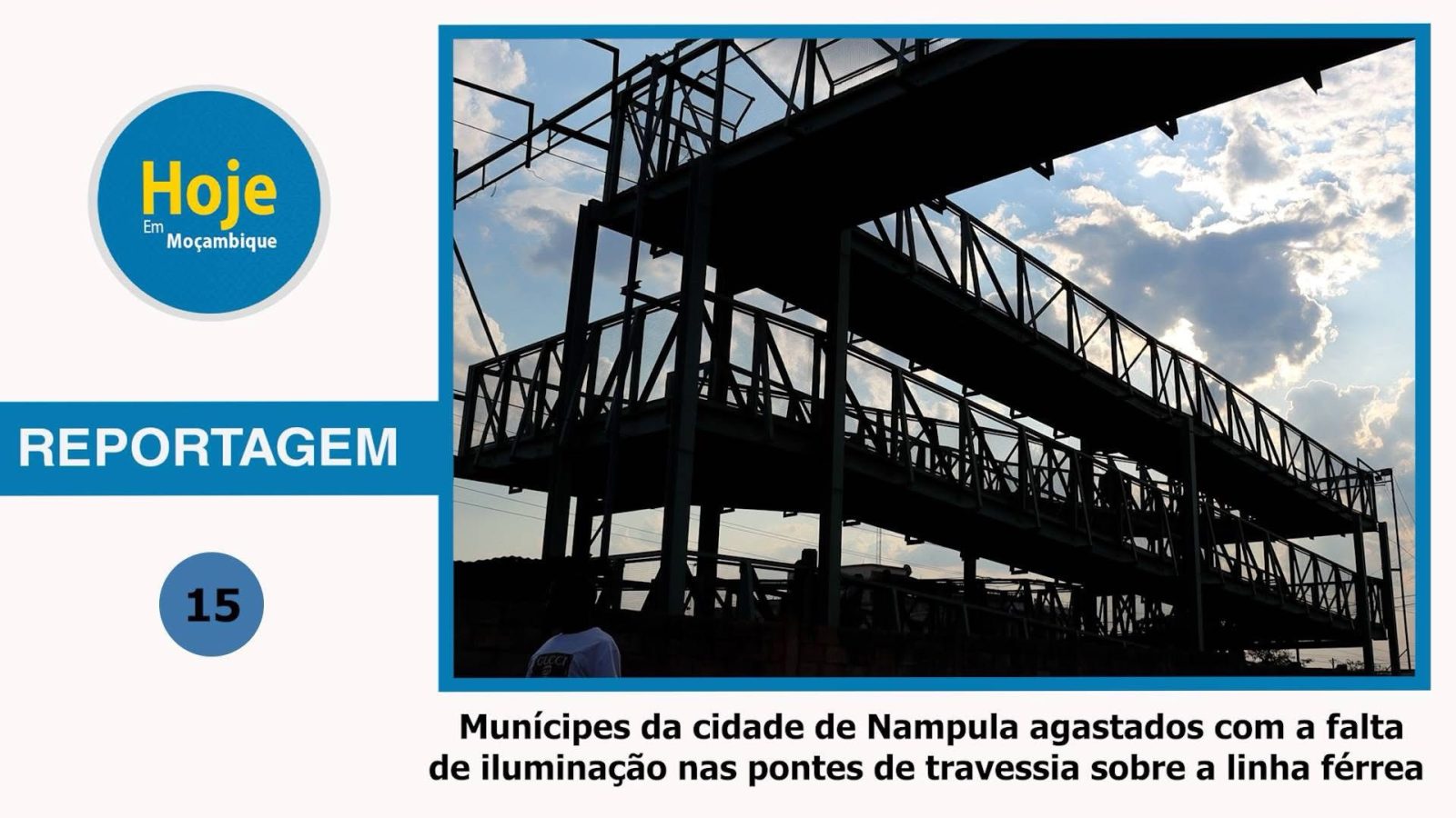 Munícipes da cidade de Nampula agastados com a falta de iluminação nas pontes de travessia Posted by @hojeemmocambique April 1, 2025 169 Views Last Updated: April 1, 2025 Previous Article Subida de preços de produtos de primeira necessidade preocupa população no norte de Moçambique Next Article Ciclone Dikeledi devasta Província de Nampula deixando 5 mortes e mais de 35mil pessoas afetadas