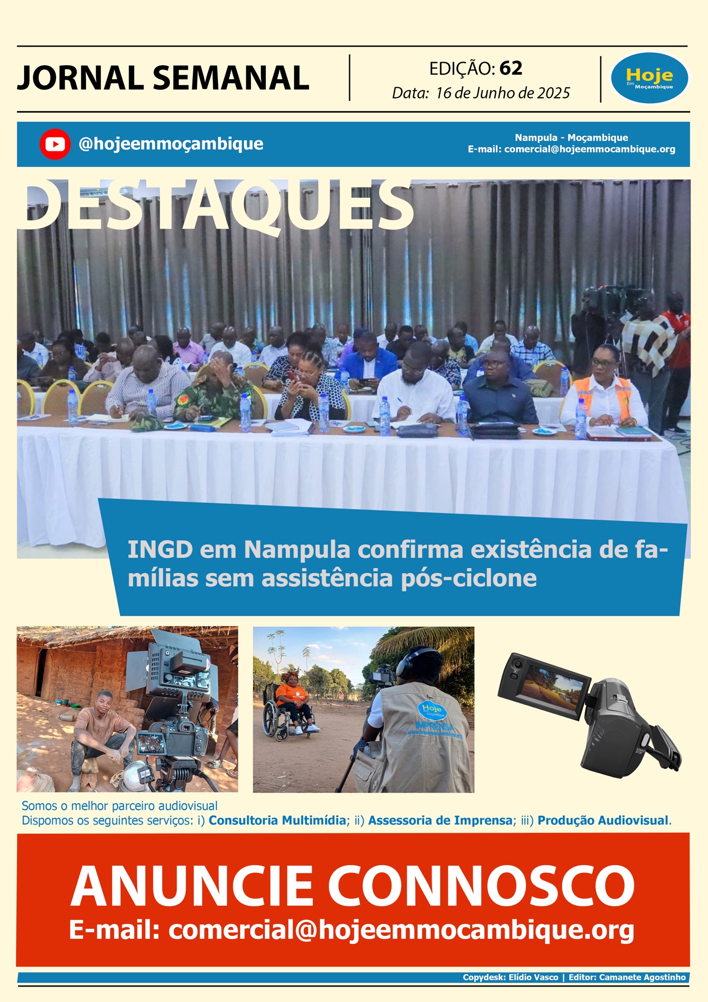INGD em Nampula confirma existência de famílias sem assistência pós-ciclone. Posted by @hojeemmocambique June 16, 2025 139 Views Last Updated: June 16, 2025 JORNAL SEMANAL-EDIÇÃO 62 -=- HOJE EM MOÇAMBIQUE.pdfDownload Previous Article Moçambique para Um Novo Passo Estratégico da Indústria de Defesa da Turquia Next Article PONTE PEDONAL DESABA EM ZONA TURÍSTICA NA ÍNDIA E DEIXA VÍTIMAS FATAIS