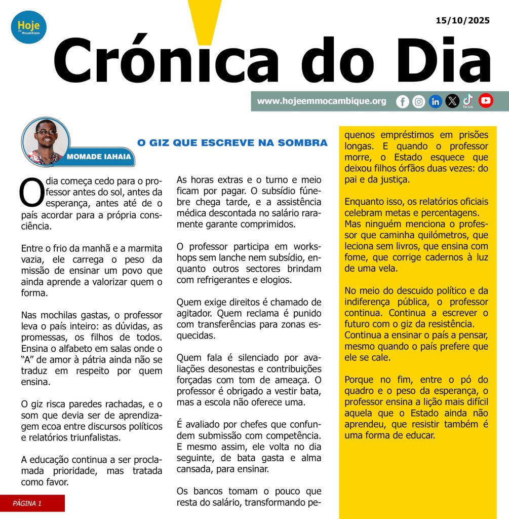 O GIZ QUE ESCREVE NA SOMBRA Posted by @hojeemmocambique October 15, 2025 72 Views Last Updated: October 15, 2025 Por: Momade Iahaia Previous Article Ataques armados voltam a semear medo no Distrito de Memba em Nampula Next Article Importância do autoexame e do conhecimento do próprio corpo