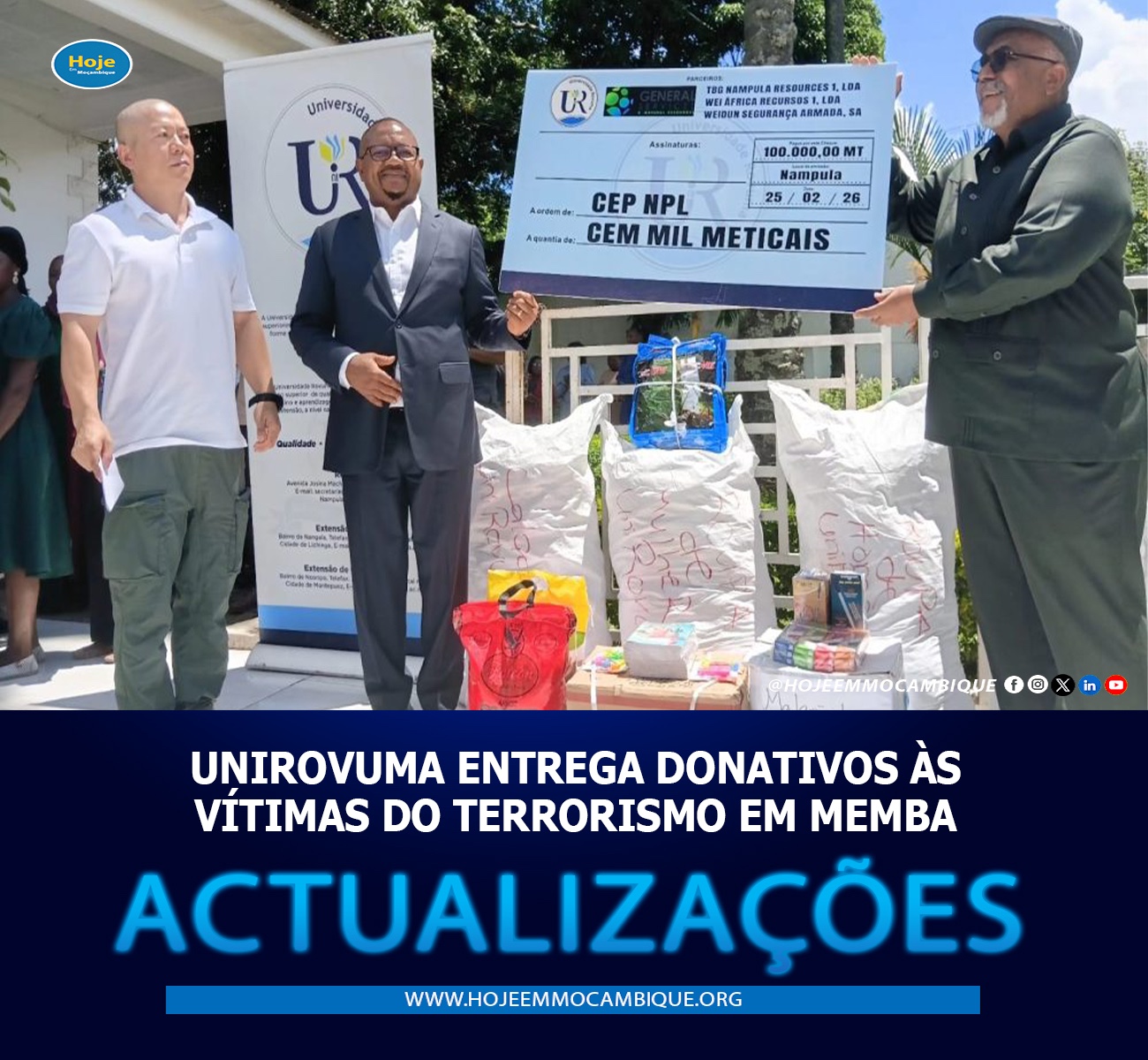 A Unirovuma, através do seu reitor Mário Caetano Brito, mobilizou parceiros e realizou uma campanha solidária que resultou na entrega de diversos produtos às famílias deslocadas pelo terrorismo no distrito de Memba, na província de Nampula.