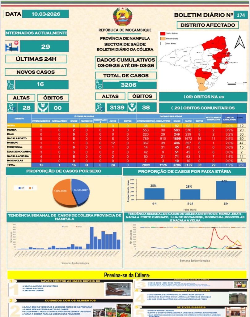 Entre os distritos afectados, Monapo apresenta maior incidência recente da doença, com 17 novos casos, seguido de Nacala-Porto, que registou 10 casos.